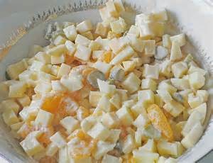 Den gewürfelten Gouda, die Apfelstückchen, die Gurken und die abgetropften Mandarinen miteinander mischen.