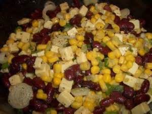 Paprika waschen und in kleine Würfel schneiden. Mais, Bohnen, Paprika in eine Schüssel geben. Käse würfeln und hinzu geben. Die Zwiebel in feine Ringe schneiden, beiseite legen.